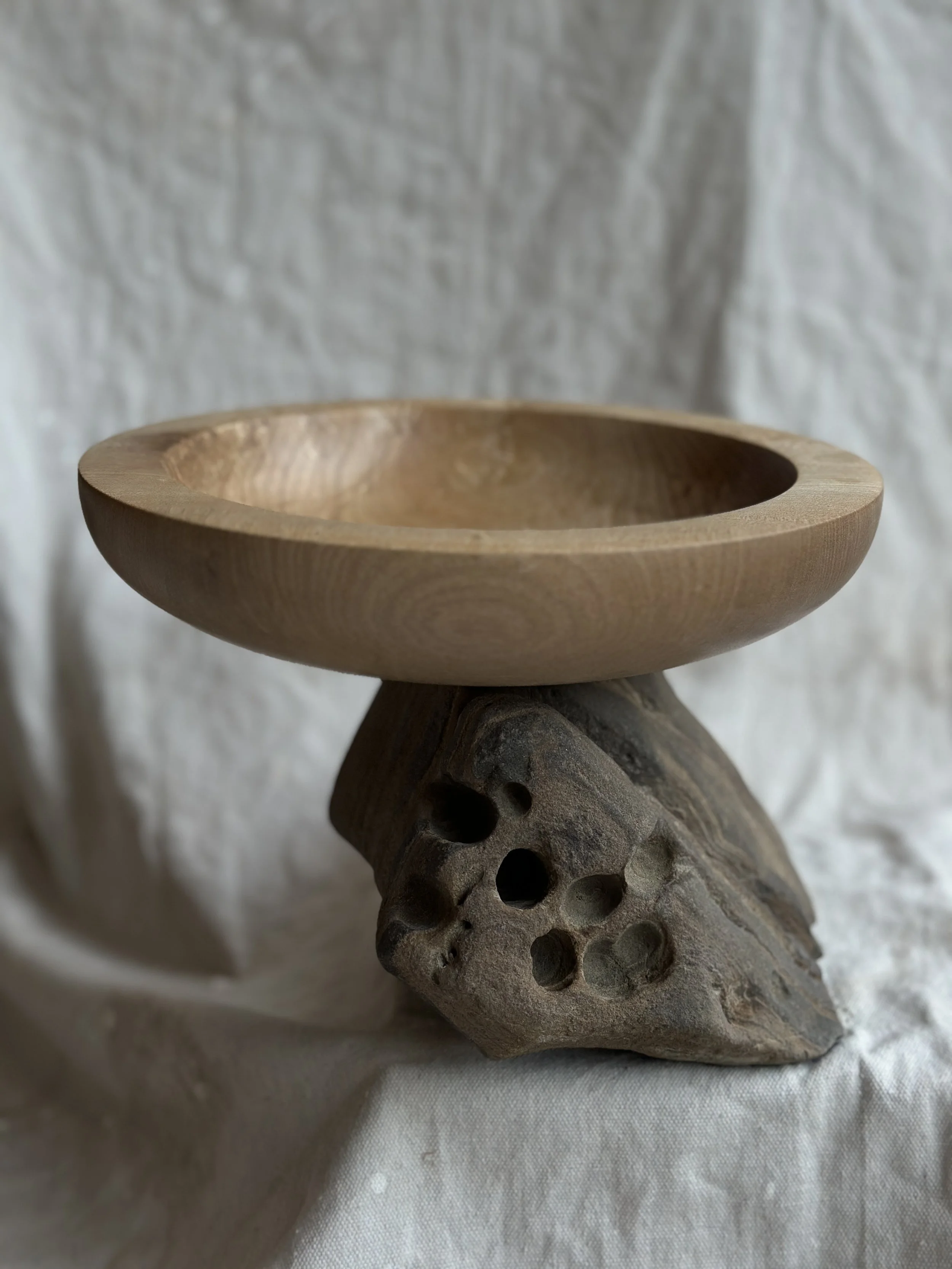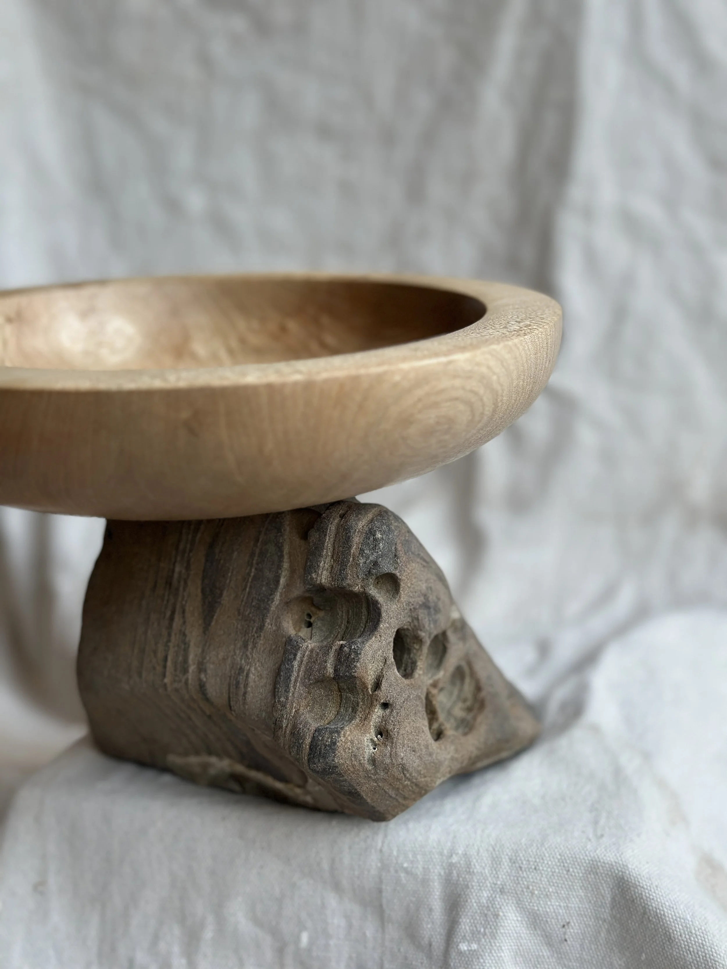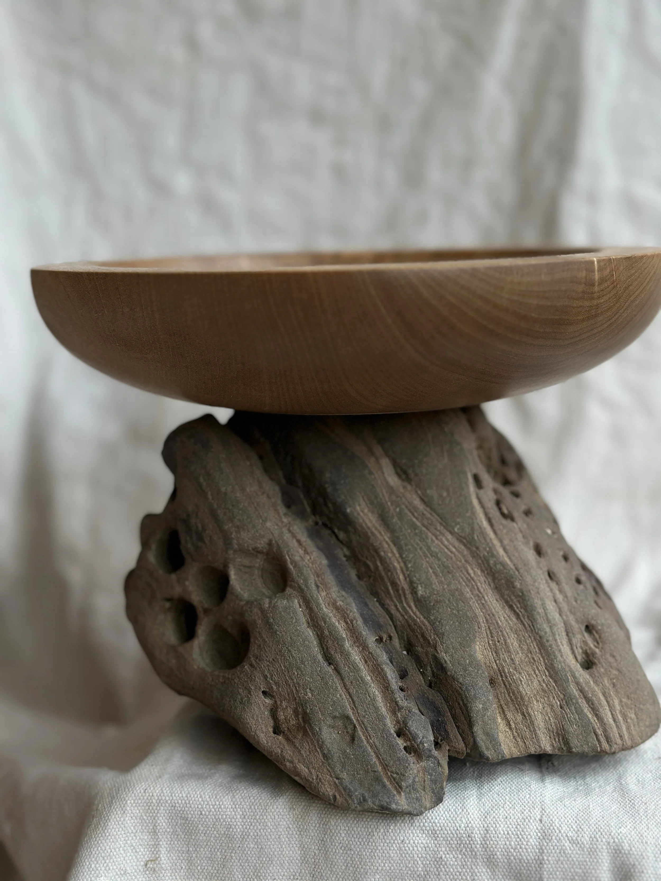 This large piece features richly grained elm resting atop a uniquely textured rock, alive with veins, honeycomb holes, and pinholes. But beyond its striking form lies a deeper story inspired by a joyful day at Glenburn Station, where the mountains meet the sea.
